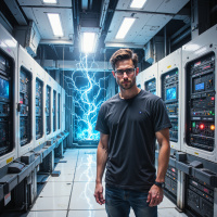 На картинке изображен мужчина, стоящий в помещении, похожем на высокотехнологичную лабораторию или диспетчерскую, заполненную рядами компьютерных серверов и другим электронным оборудованием. На нем очки, и он одет в повседневную одежду – темную рубашку и джинсы. Он смотрит прямо в камеру с нейтральным выражением лица. На заднем плане яркий синий свет исходит, кажется, из трещины в стене или панели справа, создавая ощущение высвобождающейся энергии или силы. Общий стиль и обстановка указывают на научно-фантатическую тематику.