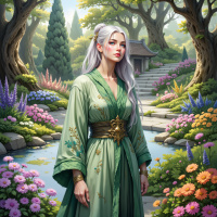 In the image, a young woman with white hair stands in a serene garden setting. She wears an elegant green dress adorned with gold embroidery and a matching headpiece. Her gaze is directed off to the side, and her expression appears contemplative. The garden is lush with various flowers and plants, contributing to a tranquil atmosphere. A small wooden structure can be seen in the background, further enhancing the idyllic setting.