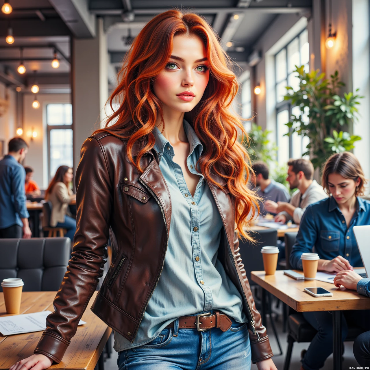 In this image, a woman with red hair stands in what appears to be an indoor setting that resembles a modern office or co-working space. She is wearing a brown leather jacket over a blue denim shirt and has a belt around her waist. Her stance is confident, with one hand resting on the table. The background shows other individuals seated at tables, engaged in work or conversation. There's an urban feel to the setting with visible light fixtures and modern furniture.