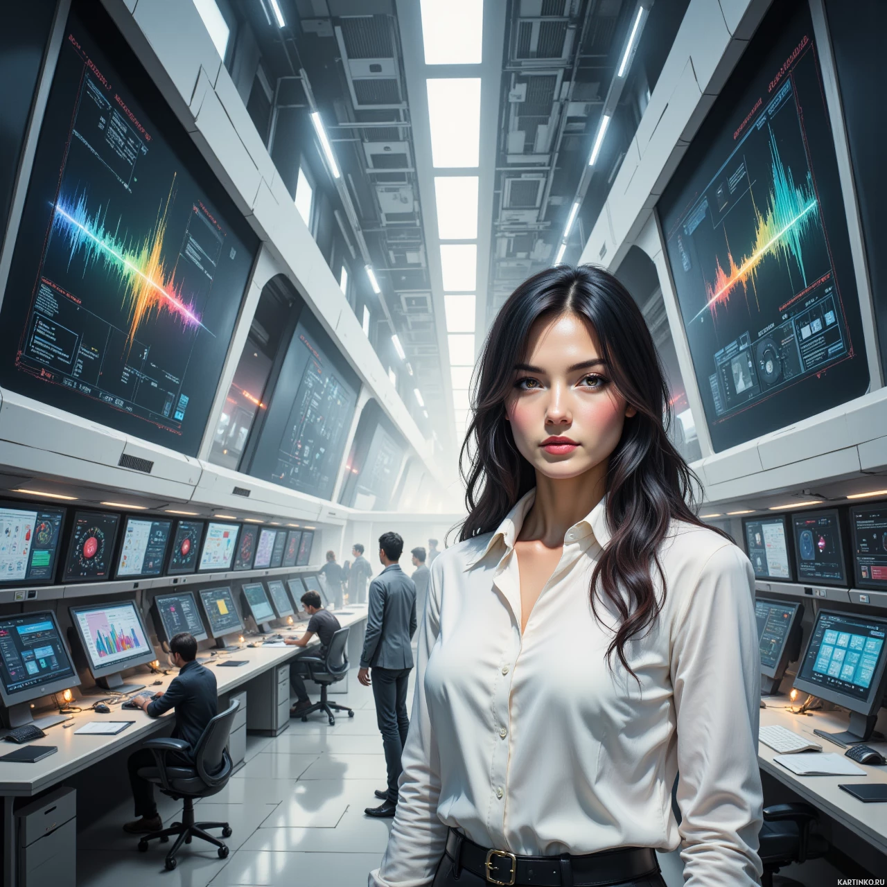 На картинке запечатлена молодая женщина, по всей видимости, восточноазиатской внешности. У неё длинные каштановые волосы, она одета в деловой костюм: тёмный блейзер поверх белой рубашки. Её взгляд серьёзный и направлен в сторону, от камеры. За ней – промышленный диспетчерский пункт, заполненный множеством компьютерных мониторов, на которых отображаются графики и диаграммы, указывающие на сложный анализ данных или визуализацию информации. Помещение выполнено в современном стиле, с металлическими поверхностями, отражающими яркий свет. На заднем плане видны другие люди, занятые своей работой у мониторов, что создаёт атмосферу профессионализма.