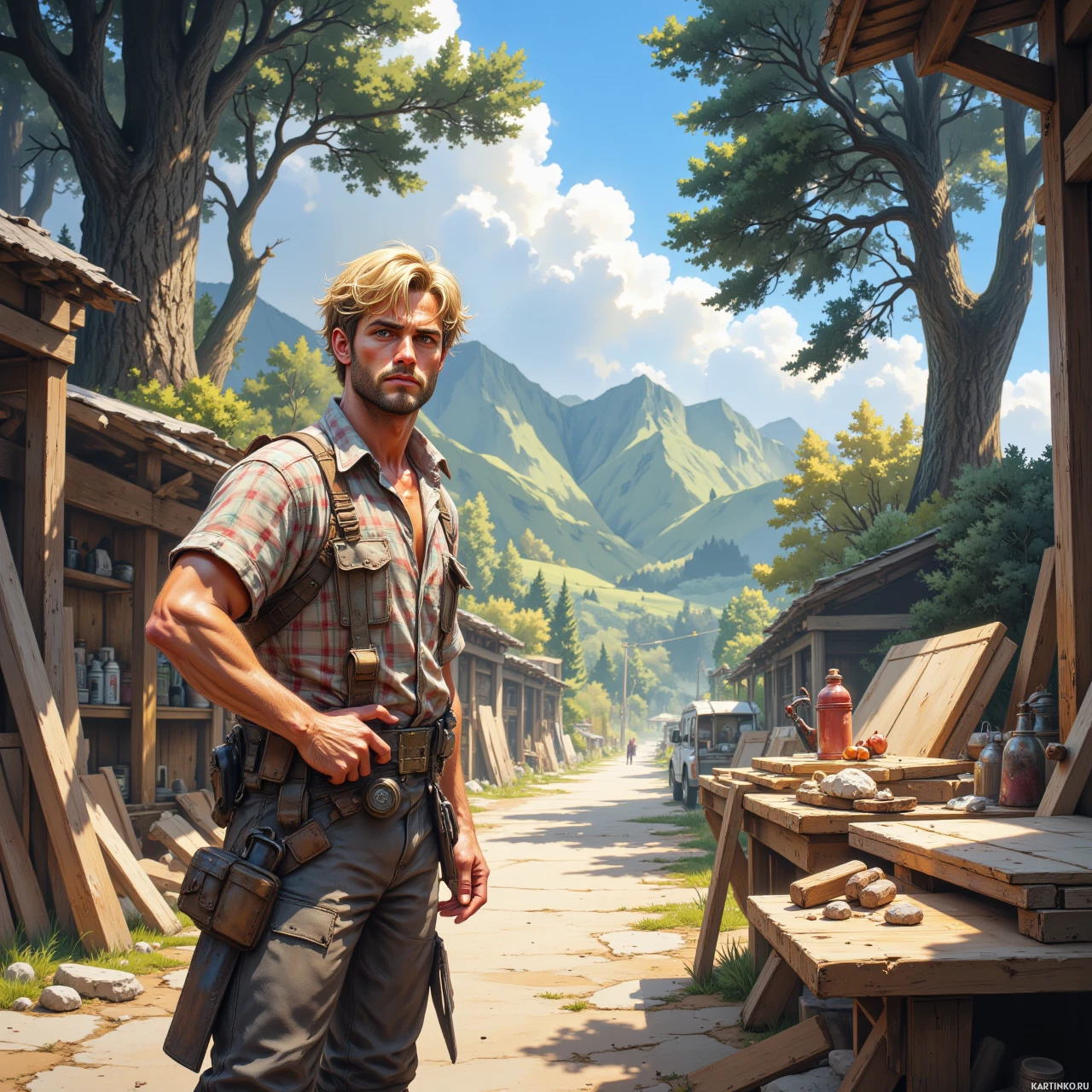 На картинке мужчина стоит на переднем плане, положив руки на боки и глядя прямо на зрителя. У него короткие светлые волосы, он одет в клетчатую рубашку, и видно, что он снабжен вещами, указывающими на то, что он, возможно, занят какой-то деятельностью на природе или исследованиями – например, винтовка перекинута через плечо, а на поясе – различные подсумки. За его спиной – вид на деревушку, затерянную в долине. На улице выстроились деревянные дома с соломенными крышами, а дорога сложена из земли или утрамбованного грунта. В центре деревни – фонтан, и, похоже, неподалеку находится рынок или место для собраний. Окружающая среда сочная и зеленая, что говорит о сельской местности с ясным небом над головой. Стиль рисунка – цифровая живопись, с большим вниманием к деталям и атмосфере.