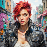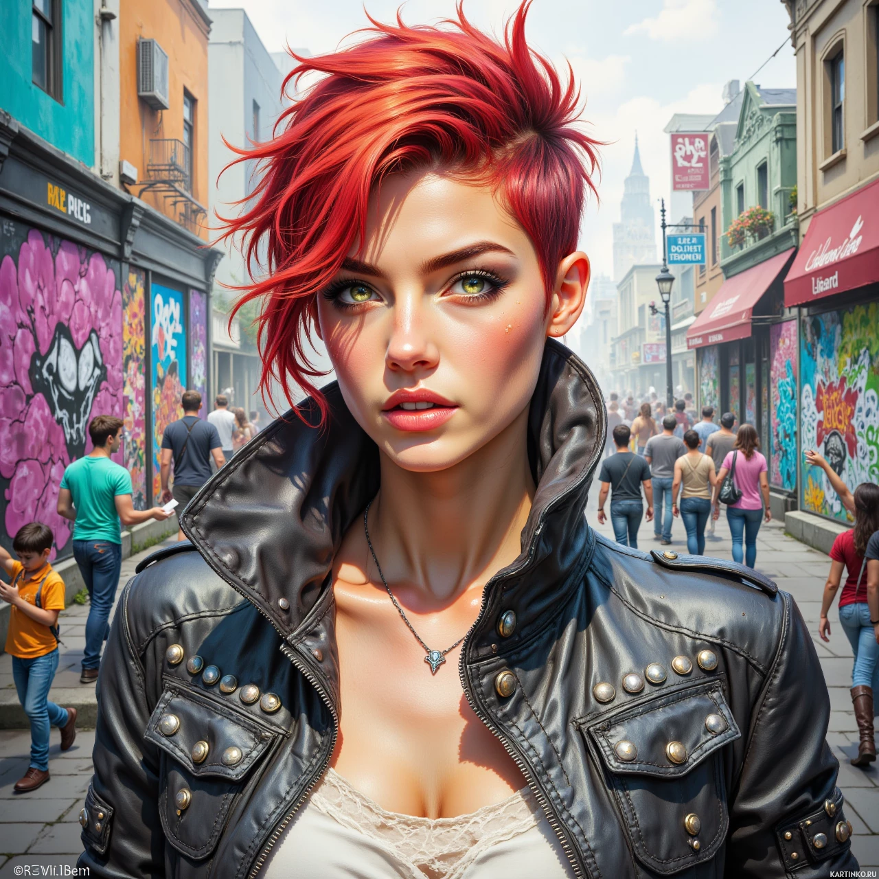 The image features a woman with vibrant red hair styled in a modern and edgy manner. Her facial expression is neutral with a soft gaze towards the camera. She has visible tattoos on her forearms, adding to her distinctive appearance. She's wearing a black leather jacket over a white top, which suggests a casual yet stylish outfit. The background shows an urban street scene, possibly a market area or festival, with colorful graffiti art and various activities going on around her.