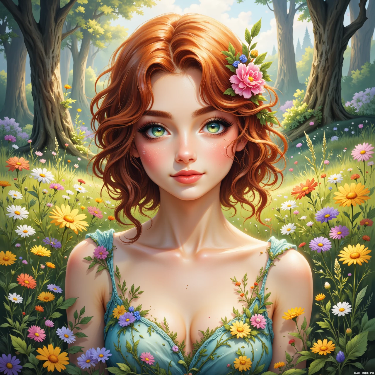 На картинке изображен стилизованный портрет девушки с ярко-рыжими волосами и пронзительными зелеными глазами, смотрящей прямо на зрителя. У нее румяные щеки, и она одета в легкий голубой или бирюзовый топ. В ее каштановых локонах, ниспадающих на плечи, заложена нежная цветок. Выражение ее лица спокойное и задумчивое. Фон намекает на естественную природу с намеками на флору и фауну, создавая пасторальную или сказочную атмосферу.
