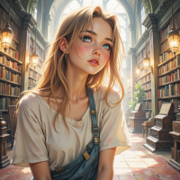 The image depicts a young woman with blonde hair who appears to be in her late teens or early twenties. She has a fair complexion and rosy cheeks, with large blue eyes that are looking slightly downwards towards the floor. Her expression is one of contemplation or sadness, as her lips are parted slightly and she seems to be deep in thought. She is wearing a light, neutral-toned top and denim overalls. The setting around her suggests an old library with wooden bookshelves filled with books that have spines displaying a variety of colors and titles. There are lamps providing illumination from above the shelves, casting soft light onto the scene. The architecture of the room has Gothic or Neoclassical features, indicated by the pointed arches and the style of the bookcases. The ceiling is high with intricate details that suggest it could be a historical building. The overall tone of the image is serene and somewhat melancholic.