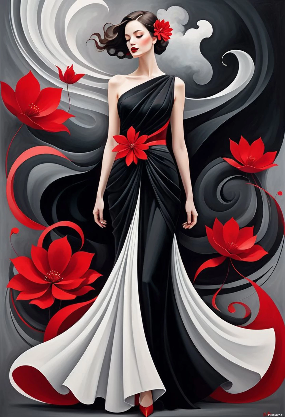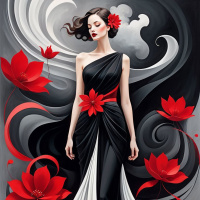 a long train on the back. The dress has a distinctive design element: flowers are artistically placed on her shoulders and waistline. The background of the artwork shows a complex pattern with swirling designs and what appears to be dark,