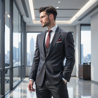 На картинке запечатлен мужчина, стоящий в офисном помещении. На нём деловой костюм серого цвета, красная галстук и платок в нагрудном кармане. У него короткие темные волосы, и он смотрит в сторону с невозмущенным выражением лица. На заднем плане видны большие окна, за которыми просматриваются очертания небоскрёбов, что позволяет предположить, что офис расположен в высотном здании в городском районе, возможно, в Нью-Йорке. Освещение в комнате яркое и деловое – типичное для корпоративных или руководящих офисов.