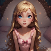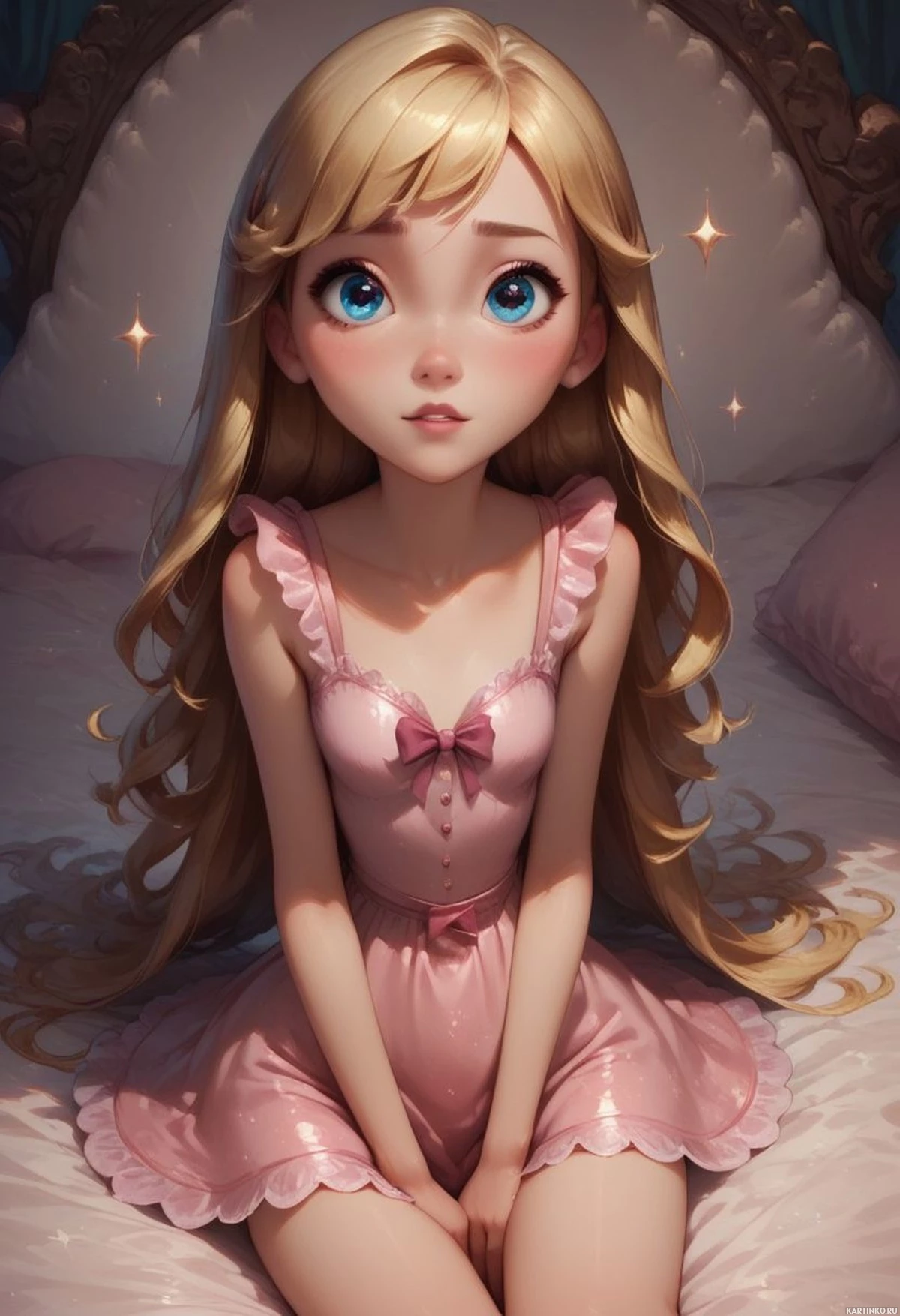 На картинке молодая женщина с светлыми волосами и выразительными голубыми глазами сидит на кровати. На ней розовое, полупрозрачное ночное платье, перекликающееся с мягкими тонами окружающего пространства. Комнату освещают свечи, отбрасывающие тёплый свет на сцену и подчёркивающие детали её наряда. Кровать, на которой она сидит, выглядит роскошно и манит своей мягкостью благодаря золотой изголовью и пушистым розовым подушкам. На прикроватной тумбочке перед ней стоит небольшой букет цветов в вазе, добавляющий нотку природы в интерьер. Картинка излучает атмосферу тихой задумчивости, усиленной мягким фокусом, слегка размывающим фон и притягивающим взгляд к женщине в центре этой сцены.