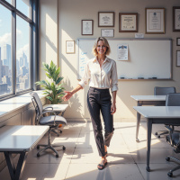 В картинке женщина стоит в комнате, где на стенах висят обрамлённые дипломы и сертификаты. У неё короткие светлые волосы, она одета в белую рубашку и тёмные брюки, и улыбается. Её рука раскрыта, словно она что-то предлагает невидимому человеку. В комнате стоит письменный стол со стульями, а на подоконнике окна, залитого солнечным светом, стоит растение.