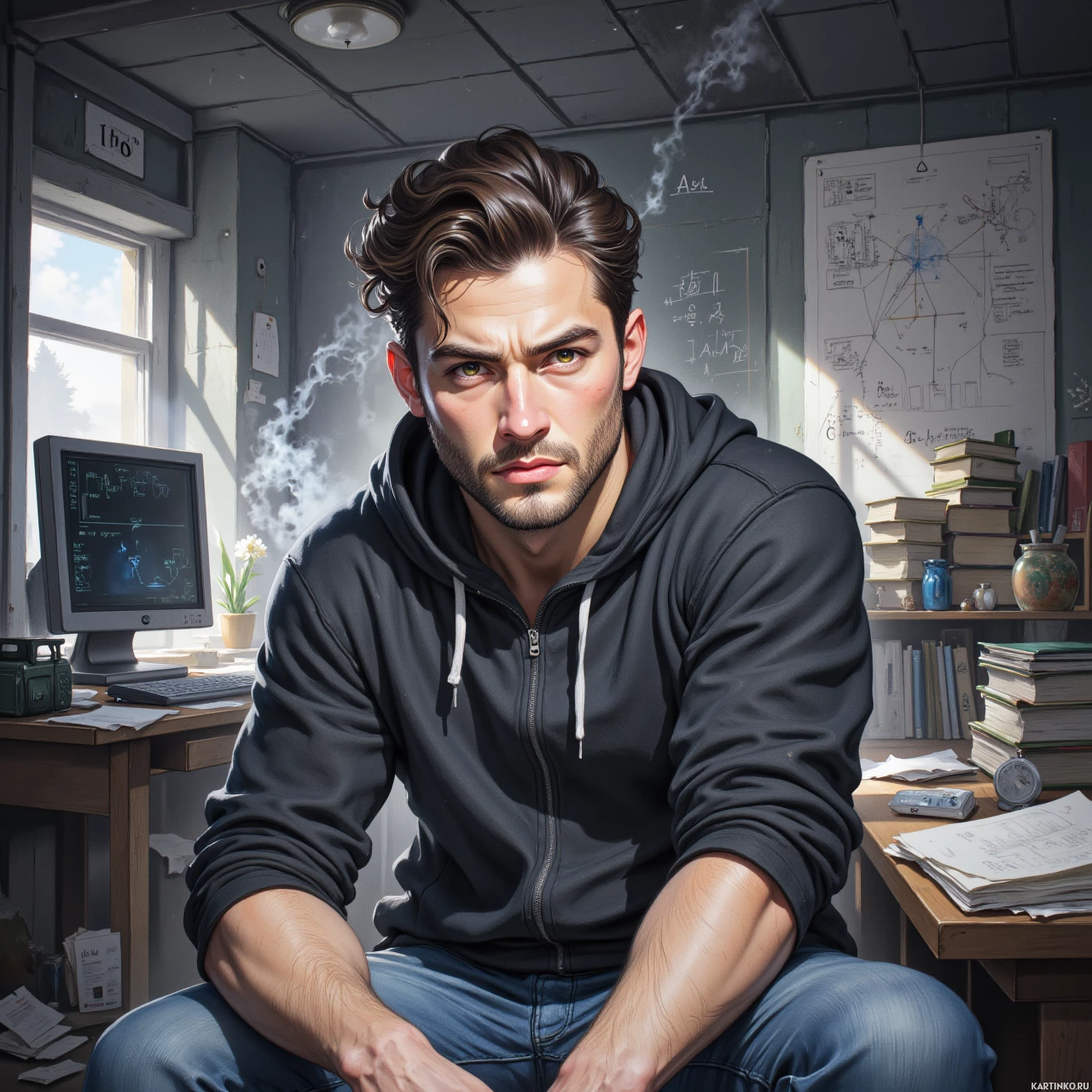 На картинке молодой человек сидит за столом, вероятно, в офисе. У него короткие волнистые волосы, и он смотрит в сторону с серьезным выражением лица. На нем темный худи и джинсы. На столе перед ним разбросаны книги и бумаги, что говорит о том, что он, возможно, занимается исследованиями или учебой. В офисе окно, через которое проникает естественный свет, и рядом с ним на столе стоит компьютерный монитор. Общая атмосфера – сосредоточенность и усердная работа.