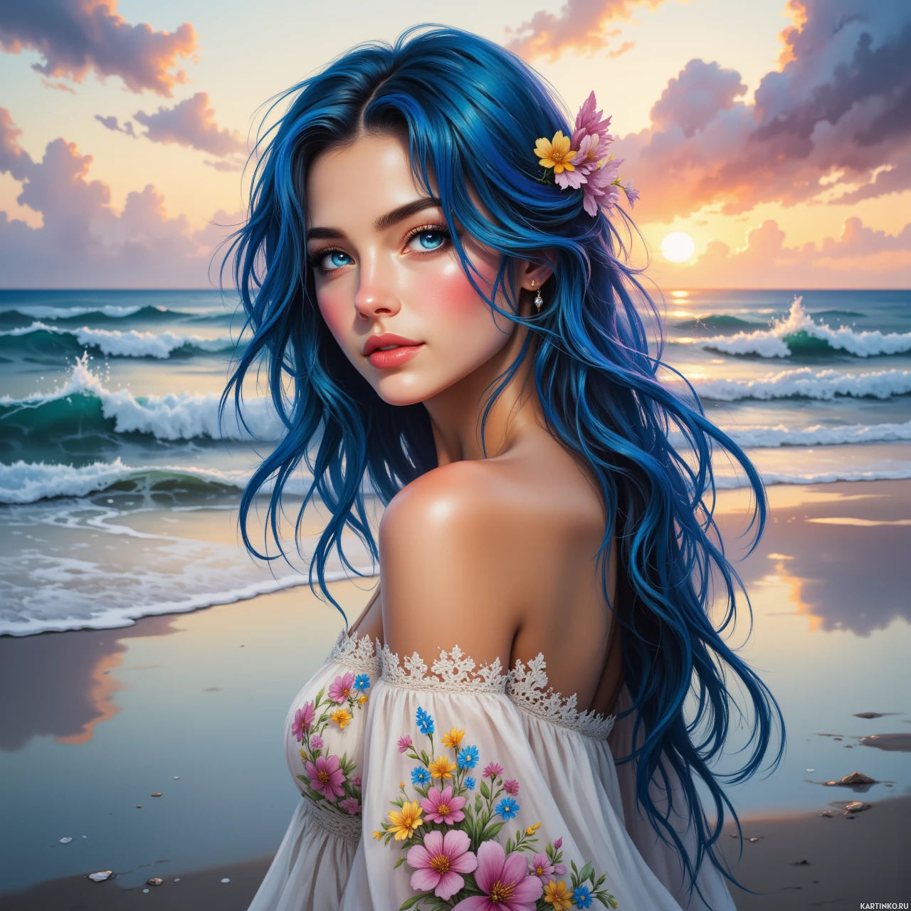 The image features a girl with blue hair standing on a beach during what appears to be either sunrise or sunset, given the colors of the sky and the warm lighting. She has long, flowing locks that are a shade of blue, contrasting with her fair skin. Her makeup includes defined eyebrows and eyeshadow, which gives her a striking appearance. She is wearing a white dress adorned with floral patterns at the chest area, giving it a romantic or fantasy-like feel. The beach setting is sandy, and there are gentle waves lapping at the shore in the background. provided.