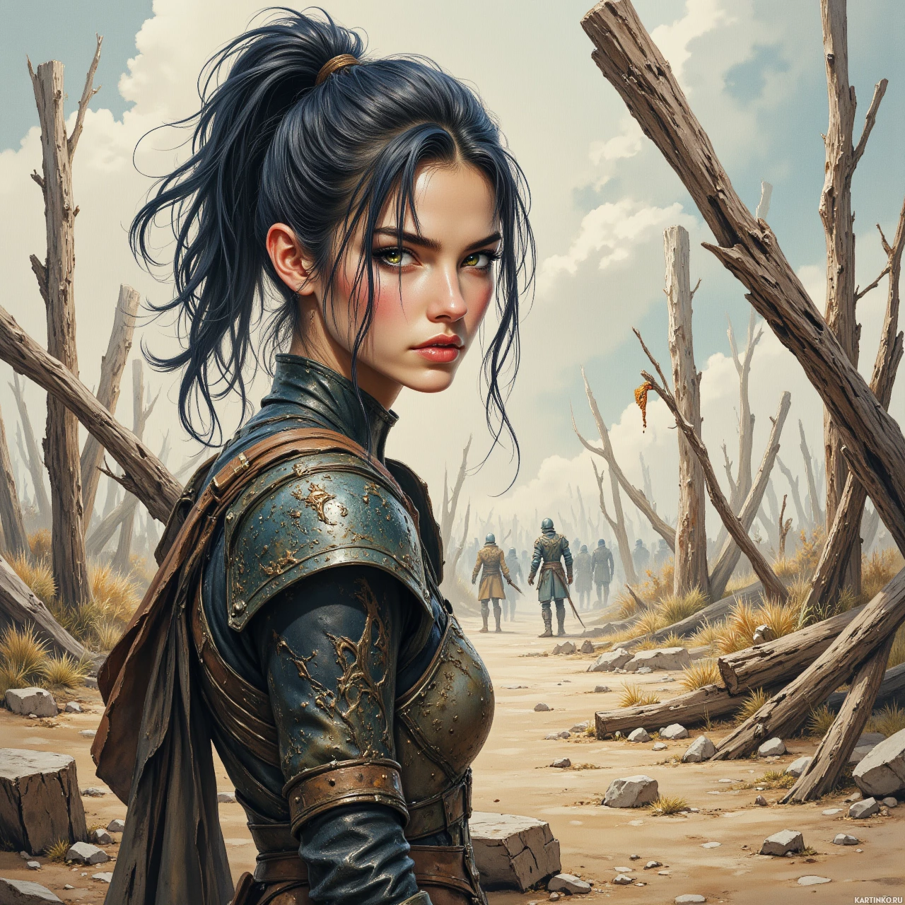 На картинке изображена женская фигура, словно сошедшая со страниц исторической эпохи или фэнтезийного мира. У неё длинные тёмные волосы и шлем с замысловатым орнаментом, указывающим на её значимость или воинский статус. Выражение лица серьёзное, она смотрит через плечо на зрителя. На заднем плане видны руины, намекающие на постапокалиптическую или израненную войной обстановку. Вдалеке едва различима фигура другого человека, возможно, союзника или противника. Цветовая гамма приглушенная, преобладают землистые тона.