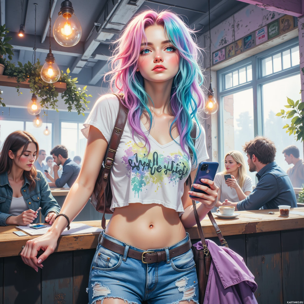 На картинке запечатлена молодая женщина с яркими розовыми и голубыми волосами. На ней повседневная одежда: фиолетовая футболка с цветным текстом и джинсовые шорты. Макияж подчеркивает необычный цвет её волос, уложенных в небрежную, но стильную прическу. В левой руке она держит телефон, возможно, общается с ним или делает фотографию. Через плечо перекинута фиолетовая сумка, что намекает на то, что она, вероятно, проводит день вне дома или возвращается с работы или мероприятия. На заднем плане – интерьер современного кафе или бара. Архитектура включает индустриальные элементы, такие как открытые трубы и воздуховоды на потолке, создавая современную атмосферу. На заднем плане видны другие посетители, занятые разными делами. Освещение на картинке мягкое, с тёплыми тонами, создающее располагающую атмосферу, несмотря на пристальный взгляд женщины, направленный на зрителя. Общая композиция изображения предполагает, что оно может использоваться для иллюстрации персонажа или рекламных материалов.