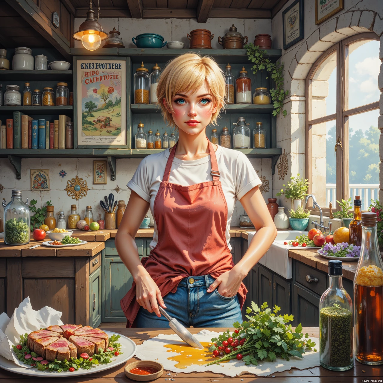 На картинке молодая блондинка стоит на кухне. На ней фартук, и кажется, она готовит. На столе перед ней – беспорядок из кухонной утвари и продуктов: бутылки с маслами или соусами, банки со специями, разделочная доска с мясом. Она держит нож, видимо, режет ингредиенты. Сама кухня очаровательна: полки заставлены бутылками и книгами, что говорит о том, что это любимое и часто используемое место для готовки.
