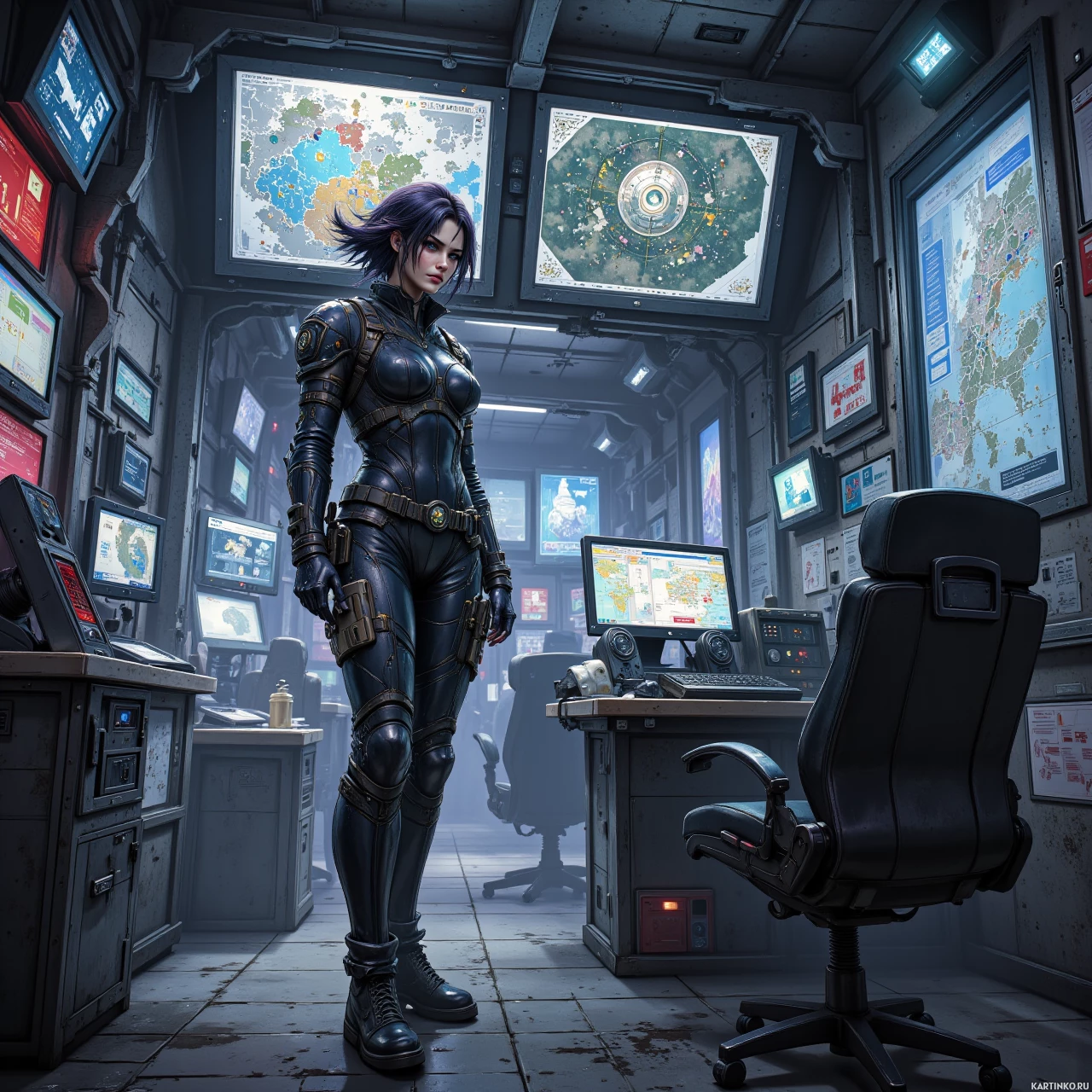 На картинке изображена девушка, стоящая в обстановке, напоминающей кабинет, но в научно-фантастическом сеттинге. У неё фиолетовые волосы и она одета в чёрный тактический костюм с элементами брони. Она стоит уверенно, руки на бёдрах, прямо смотрит на зрителя. За её спиной – огромная стена, уставленная мониторами с картами и графиками, что указывает на передовой командный или операционный центр. Общая атмосфера картинки – футуристичная и высокотехнологичная.
