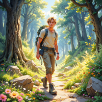 На картинке мужчина идёт по лесной тропинке. Похоже, он совершает поход, у него за плечами рюкзак и в руках трекинговая палка, что говорит о том, что он отправился в приключение на природе или в поход. Местность утопает в зелени, повсюду – полевые цветы, создавая ощущение дикой природы и спокойствия.