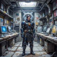 This image depicts a figure dressed in futuristic armor standing inside an industrial setting that appears to be a control room with various screens and panels. The figure is positioned facing the viewer, emitting a confident stance. The armor has intricate details and incorporates elements of both medieval and modern design, suggesting a blend of fantasy and science fiction themes. The overall atmosphere is one of high-tech functionality combined with an almost steampunk aesthetic.