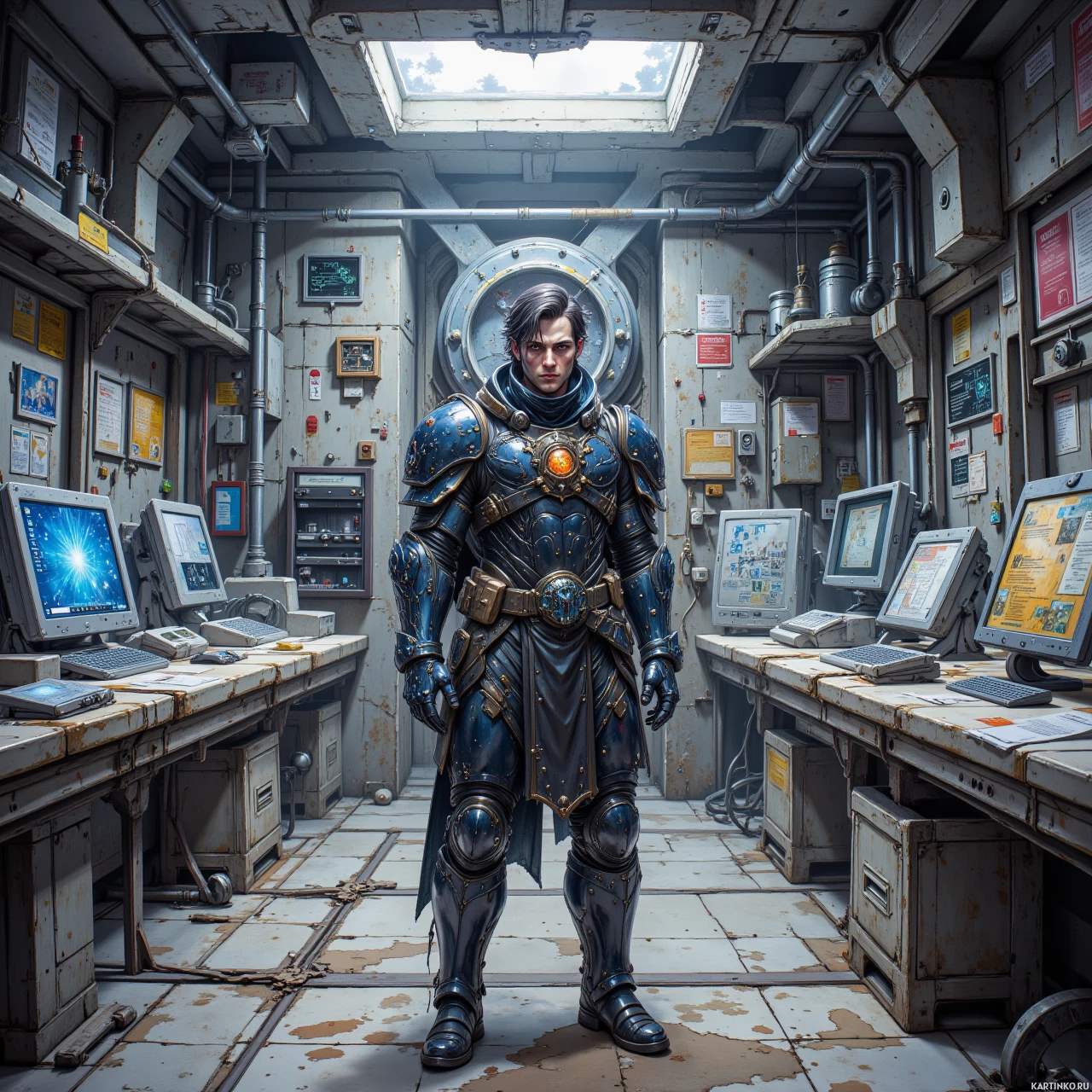 На картинке – персонаж в футуристических доспехах, стоящий в индустриальном помещении, похожем на контрольную панель с множеством экранов и приборов. Он повернут к зрителю, его поза излучает уверенность. Доспехи отличаются сложной детализацией, сочетают в себе элементы средневекового и современного дизайна, что говорит о переплетении фэнтези и научной фантастики. Общая атмосфера – это сочетание высокотехнологичной функциональности и почти стимпанк-эстетики.
