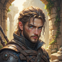 На картинке изображен мужчина, похожий на воина из фэнтезийного мира. У него каштановые волосы до плеч, голубые глаза, устремленные в сторону, и серьезное выражение лица. Кожа мужчины словно освещена солнцем, будто он долгое время находился на улице или под яркими лучами. Он одет в кожаную броню с металлическими вставками, которая выглядит изношенной и прошедшей испытание боем. Несколько ремней и лямок на броне говорят о практичности и готовности к бою. На спине закреплен колчан со стрелами, что указывает на то, что он может использовать лук и стрелы в сражении. Фоном служит каменный арочный проем или руины древнего сооружения, намекающие на исторический или мифологический контекст. Взгляд и поза мужчины свидетельствуют о готовности к действиям или, возможно, о недавнем возвращении из боя.