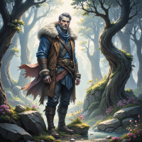 This is an illustration of a male character standing in a forest setting. He appears to be wearing medieval-style clothing, including a long tunic and boots that reach up to his knees. The character has a rugged facial expression with dark hair and a full beard. There are trees around him with moss and foliage visible on the trunks. The lighting in the scene suggests it might be either dawn or dusk due to the soft glow emanating from behind the trees.