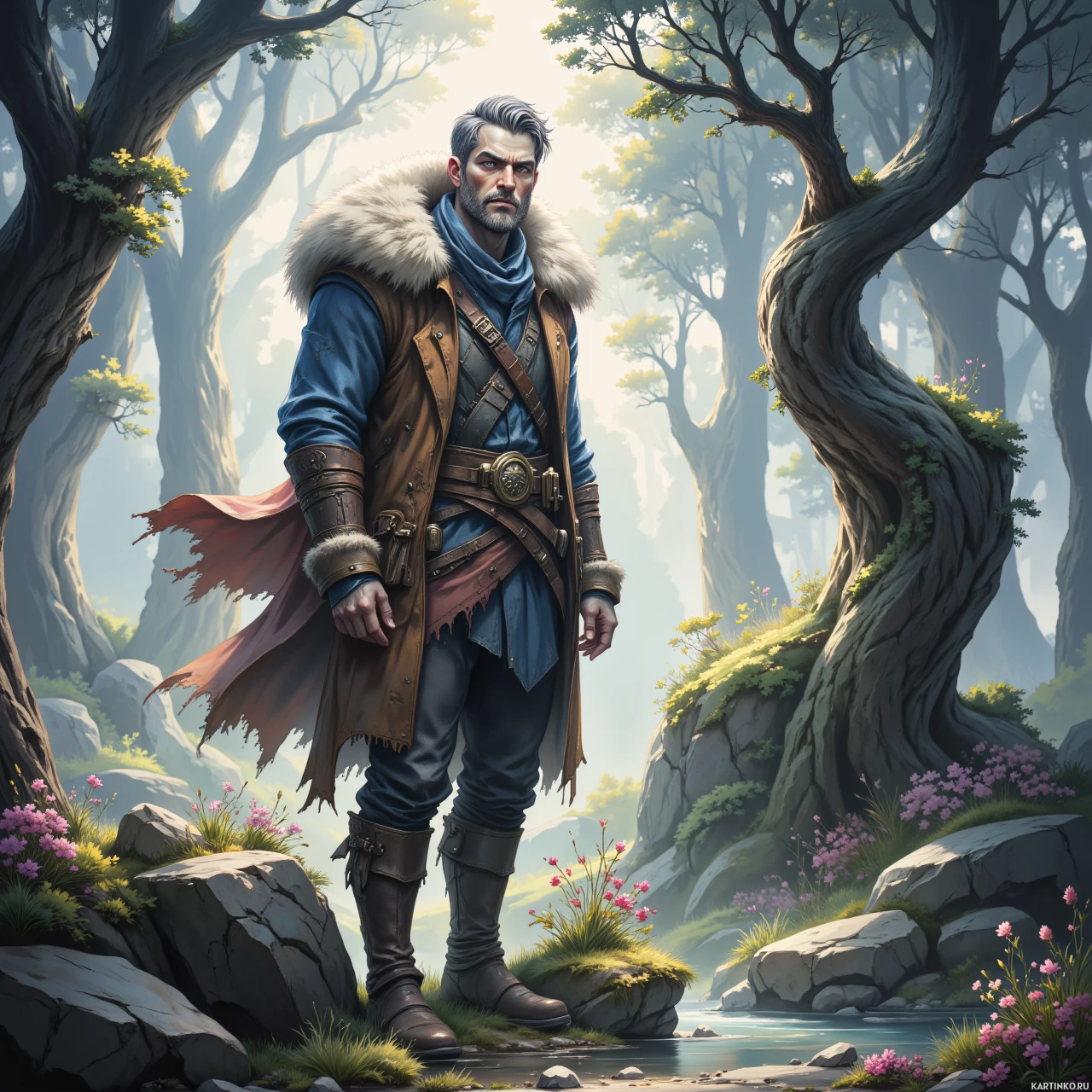 Это картинка с изображением мужчины, стоящего в лесу. На нём одежда в средневековом стиле: длинная туника и сапоги до колен. У персонажа суровое выражение лица, тёмные волосы и густая борода. Вокруг – деревья, на стволах видна мха и листва. Освещение в сцене предполагает, что это либо рассвет, либо закат, из-за мягкого света, исходящего из-за деревьев.