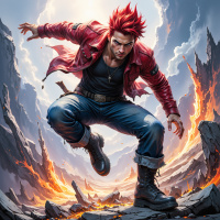 The image features a male character in an action pose. He has red hair and wears a red jacket with the sleeves torn off, revealing muscular arms. His attire includes blue jeans and black combat boots. Behind him is a fiery backdrop, suggesting a chaotic environment.