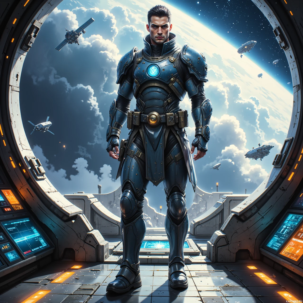 На картинке изображен мужчина, стоящий в центре, одетый в футуристическую броню с металлическим блеском. Броня детализирована и выполнена в научно-фантастическом стиле, что указывает на её защитную или боевую функцию. Справа от центральной фигуры расположены несколько экранов, на которых отображаются различные данные или панели управления, создавая общее впечатление передовых технологий в космической обстановке. На заднем плане вид планеты с облаками и кораблями на орбите, что говорит о том, что действие происходит в открытом космосе или на космическом корабле. Стиль картинки иллюстративный, характерный для концепт-арта видеоигр или научно-фантастических визуальных повествований.