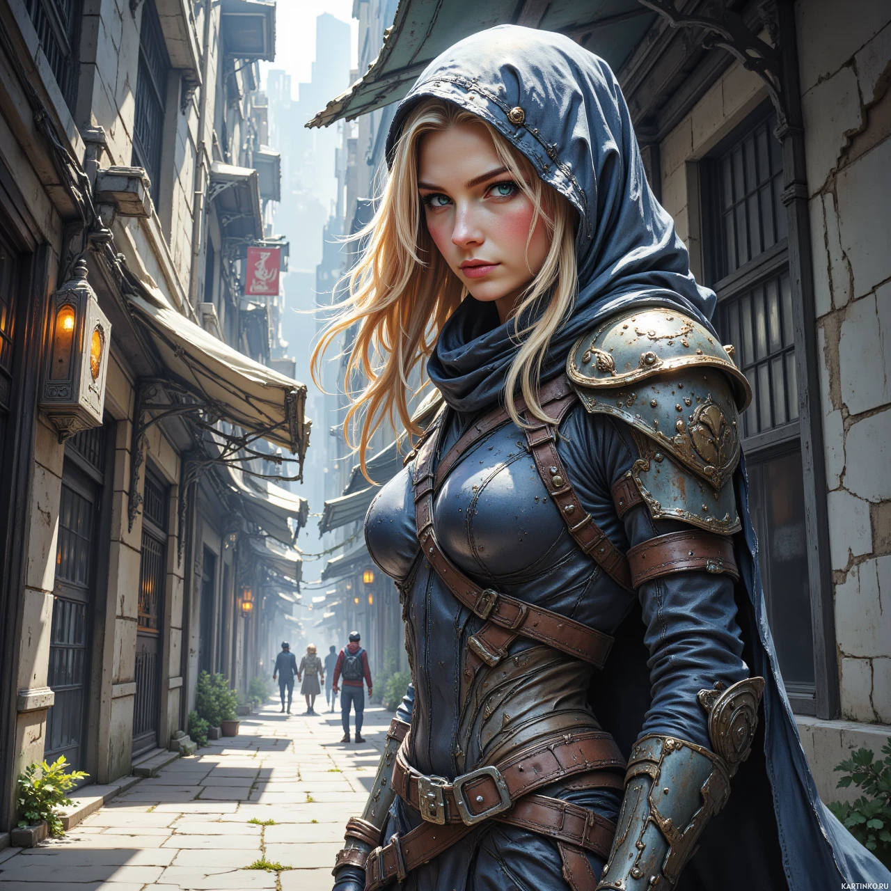 На картинке молодая женщина с золотистыми волосами и поразительно голубыми глазами уверенно стоит в переулке. На ней темная кожаная броня с капюшоном, обрамляющим лицо. На броне сложный металлический декор, указывающий на фэнтезийный или исторический сеттинг. Задний план – узкая улица с каменными зданиями, вдалеке видны другие люди, добавляющие глубину. Её взгляд направлен прямо на зрителя, излучая ощущение готовности и ожидания.