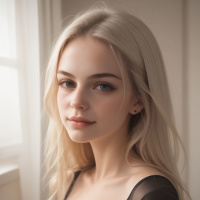 a young woman with short blonde hair. She has a fair complexion and is wearing what appears to be