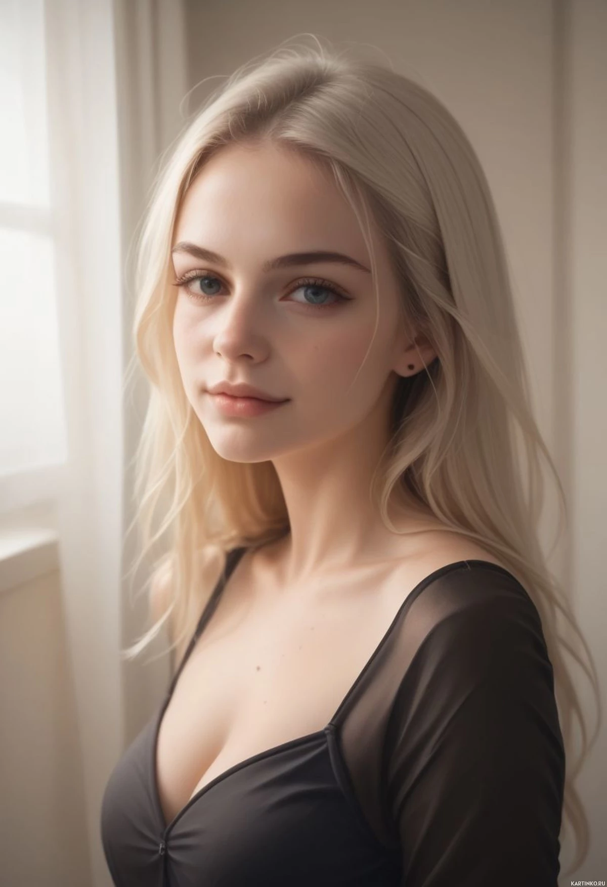 a neutral expression. There is a window in the background, suggesting