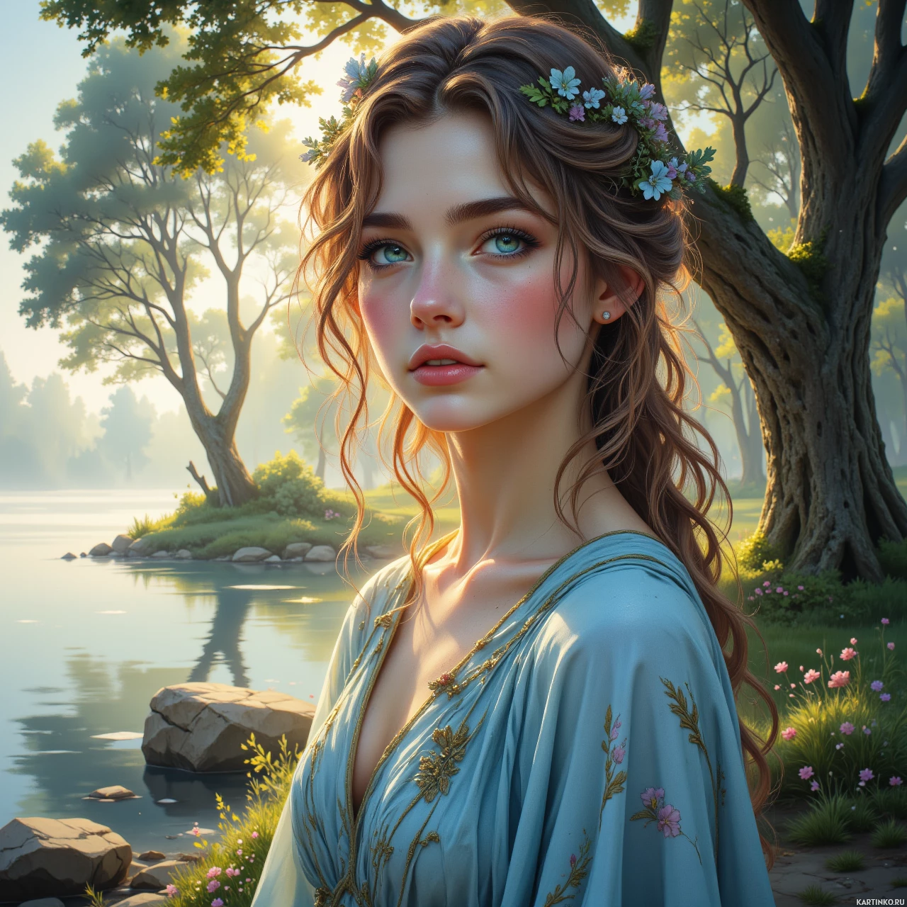 In the image, there is a young woman with long brown hair and blue eyes. She has a fair complexion and a delicate nose. Her lips are slightly parted, revealing her teeth. She appears to be wearing a light-colored dress that reaches her feet, adorned with intricate patterns that resemble a floral or tree design. Atop her hair, there's a small crown-like accessory featuring what appears to be blue flowers or leaves. The background is a serene setting of a forest with trees and foliage surrounding a body of water, possibly a lake or river, which is partially visible on the left side of the image. The lighting suggests it might be early morning or late afternoon, given the soft illumination that casts shadows on the ground.