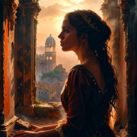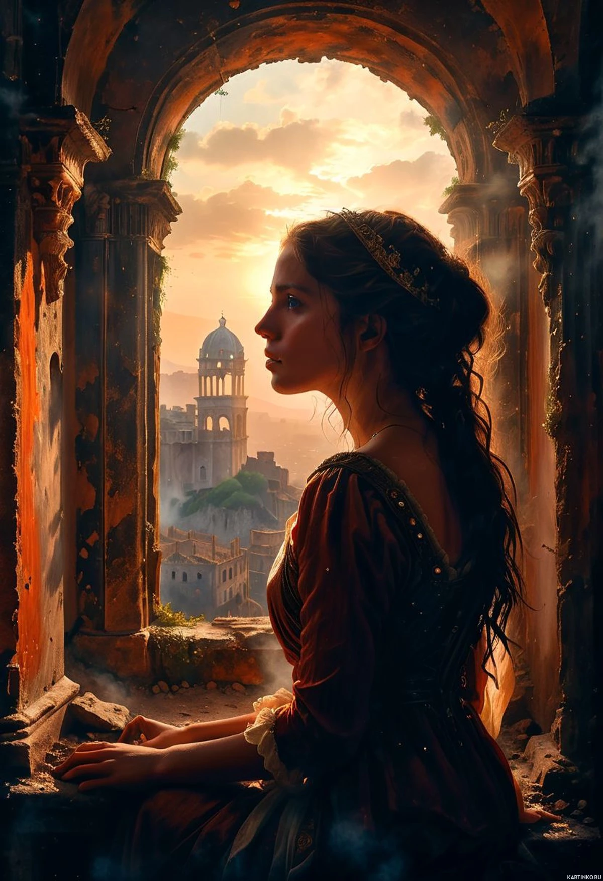 the warm light illuminating a castle or temple in the distance and other architectural structures lining the landscape below her perch. There are also silhouettes of figures that suggest