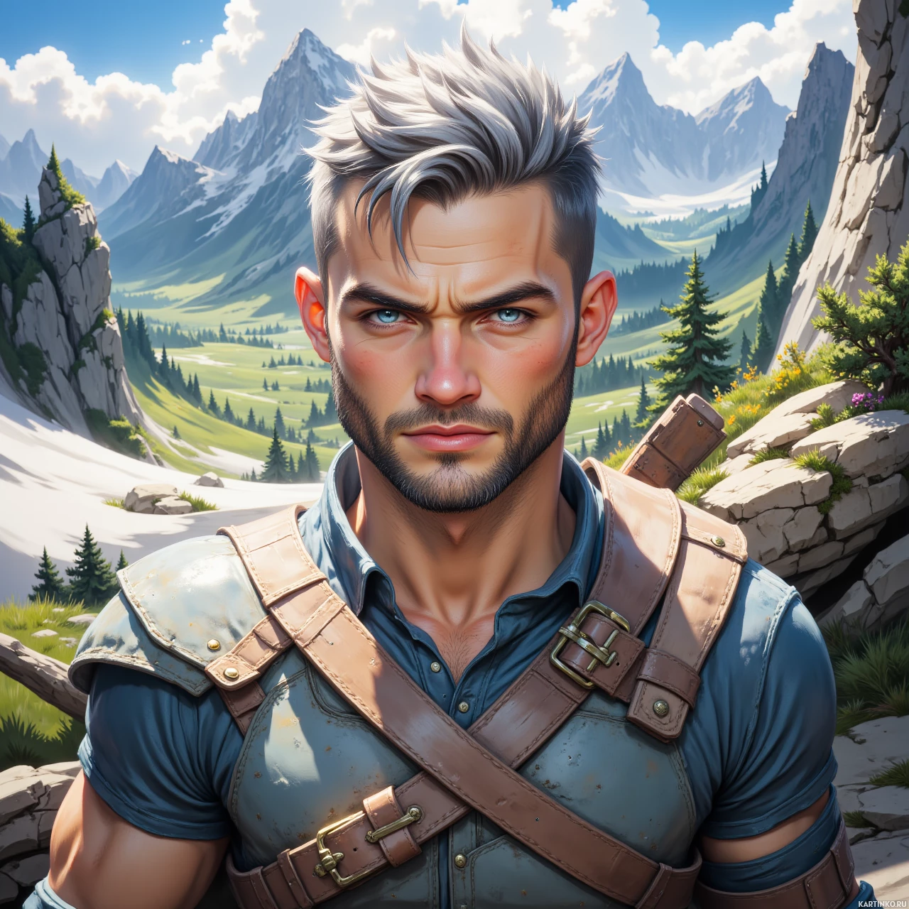 На картинке изображена женщина с короткой светлой прической, смотрящая прямо в камеру. У неё выразительные голубые глаза и светлая кожа. Макияж подчеркивает её естественную красоту, такие черты, как пухлые губы и чёткие брови. На ней чёрный водолазка под светлым пиджаком или жилеткой. На заднем плане видны картины, что говорит о том, что она, возможно, находится в художественной галерее или мастерской. Общий стиль картинки – реалистичный, с лёгкой стилизацией.