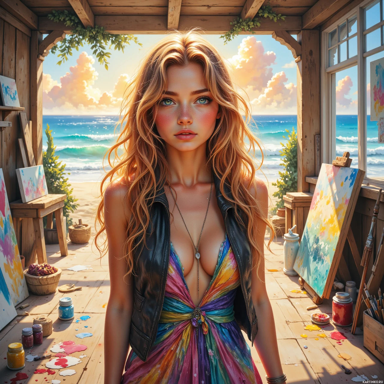 На этой картинке молодая женщина с золотистыми волосами и поразительно голубыми глазами стоит на пляже на закате. На ней яркое, красочное платье, которое добавляет пляжной и артистичной атмосфере сцены. Местоположение выглядит спокойным и живописным, с деревянным домиком на заднем плане и мольбертом неподалеку, что может говорить о том, что она художник. Небо над ней окрашено теплыми тонами заходящего солнца, отбрасывающими длинные тени на песок под ногами. Общая атмосфера картинки наводит на мысль, что она может быть связана с рекламой или промо-материалами для пляжного мероприятия или продукта, учитывая стилизованное и несколько идеализированное изображение.