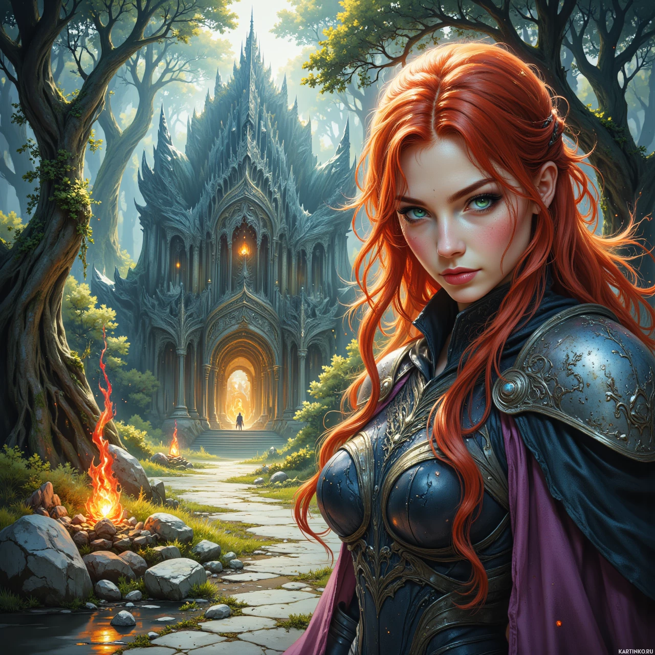 На картинке изображена героиня с ярко-рыжими волосами, облаченная в богато украшенную темную броню и шлем со сложным орнаментом. У неё серьёзное, сосредоточенное выражение лица, она смотрит в сторону. За её спиной возвышается древняя, величественная структура, похожая на замок, с высокими шпилями и несколькими уровнями, утопающая в сочной зелени и деревьях. Обстановка создает впечатление фантастической или исторической сцены.