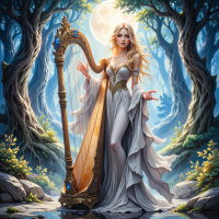 In the image, a young woman with long blonde hair stands amidst a magical forest under the glow of a full moon. She is adorned in elegant attire resembling ancient Greek or Roman clothing, featuring a flowing dress and headdress. Her right hand rests on a lyre, suggesting she is playing music. The background reveals an enchanting forest scene with towering trees reaching for the sky, their branches gently swaying in the moonlight. A stream meanders through the center of the image, adding to the tranquility and beauty of the scene. The overall atmosphere evokes a sense of harmony between music and nature.