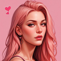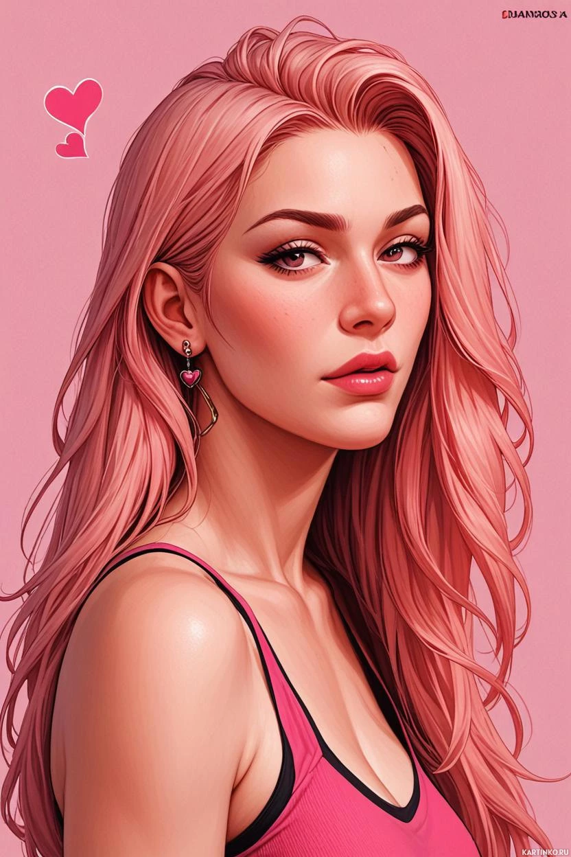 heart shape at the bottom right corner of the image, which might suggest affection or love. She is wearing an off-the-shoulder pink top that complements her hair color and overall aesthetic. The background is simple and does not distract from the subject, allowing the viewer to concentrate on the details of the artwork.