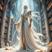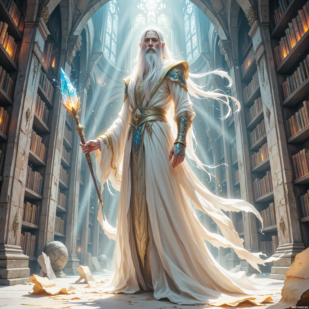Картинка изображает фантастическую сцену: в центре величественной библиотеки стоит пожилой мужчина с длинной белой бородой, по всей видимости, маг или мудрец. На нем – богато украшенная золотая броня, в руках посох с синим самоцветом на верхушке, излучающий мягкое свечение, которое, кажется, освещает его лицо неземным светом. Плащ развевается за спиной, намекая на движение или магию. Окружающая обстановка поражает детализацией: высокие стеллажи, заполненные древними томами, декоративные статуи – всё это создает мистическую атмосферу.