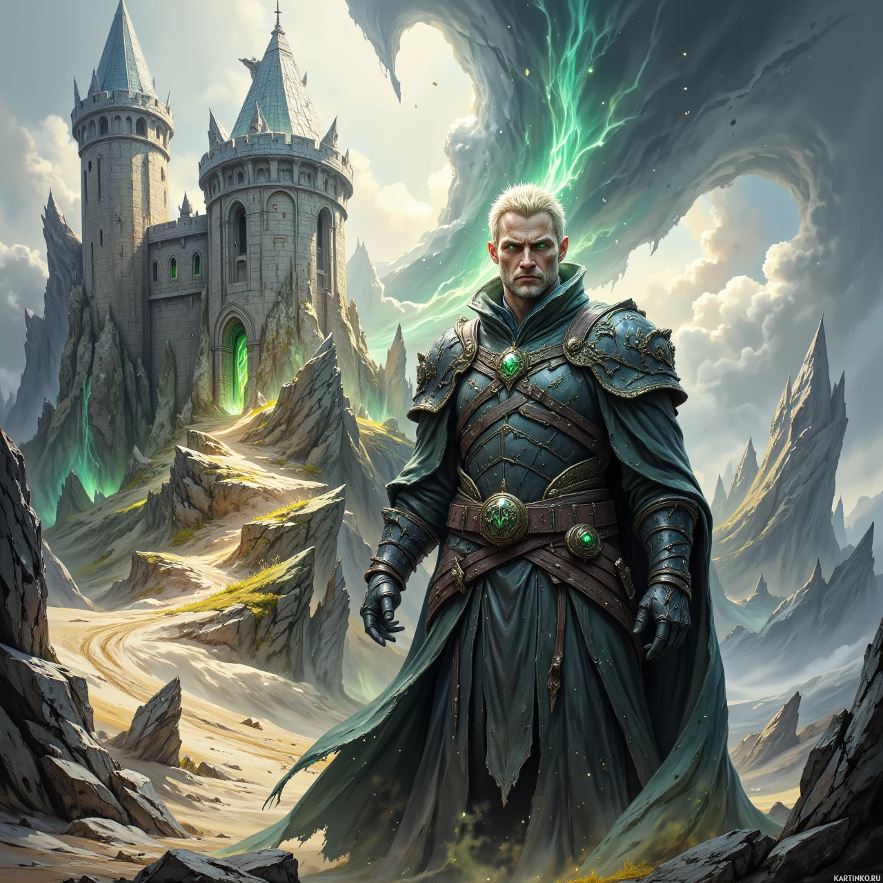 Воин, застывший перед замком, крепко сжимает в руках посох. На нём доспехи со сложной гравировкой, а у пояса – сумка. На заднем плане – скалистые выступы, создающие эффектный фон. Картинка.
