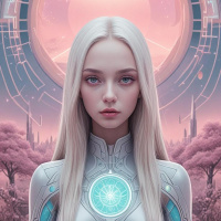 The image features a female character with white hair. She is wearing a futuristic armor that has a prominent circular emblem or logo on her chest. Behind her is a backdrop of an otherworldly landscape, which includes what appears to be a crescent moon and a planet resembling Earth's, set against a star-filled sky. The overall style of the image suggests it could be related to science fiction or fantasy genres.