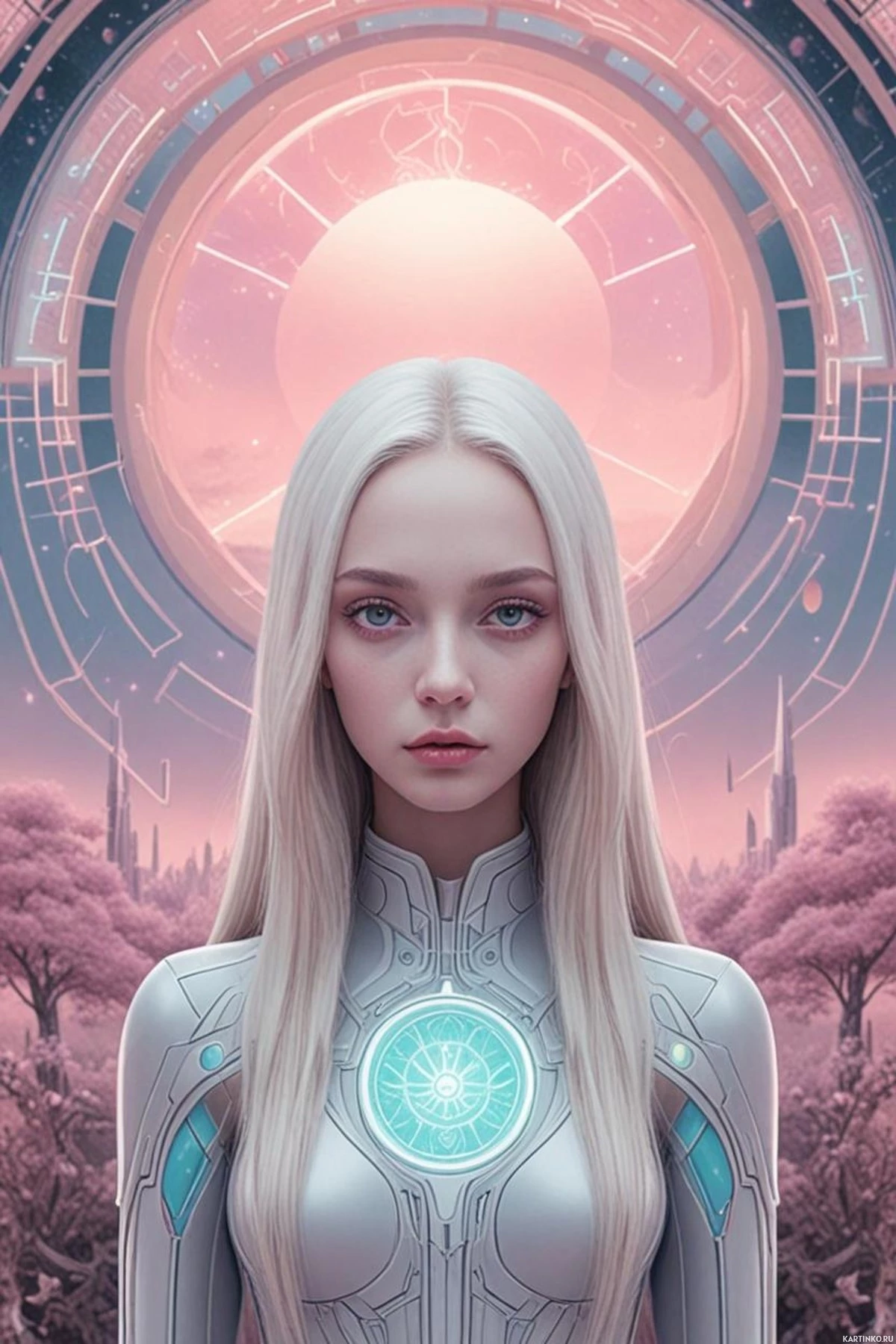 На картинке изображена девушка с белыми волосами. На ней футуристический доспех с крупным круглым символом или логотипом на груди. На заднем плане – инопланетный пейзаж с серповидной луной и планетой, похожей на Землю, на фоне звездного неба. Стиль картинки указывает на принадлежность к жанрам научной фантастики или фэнтези.