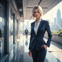 На картинке запечатлена молодая женщина, стоящая на отражающем полу на фоне городского пейзажа. У неё короткие светлые волосы, и она одета в тёмный костюм: пиджак, рубашка и брюки. Её осанка уверенная и грациозная, руки скрещены перед собой, а тело слегка повернуто к зрителю. Справа в кадре видно мужчину, отходящего от женщины, но его лицо не видно; виден только затылок и пиджак. Место действия предполагает городскую среду, возможно, на крыше здания, судя по архитектуре и стеклянным панелям, отражающим окружающий пейзаж.