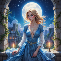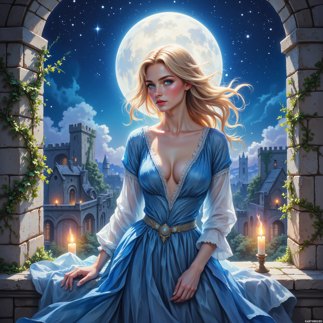 На картинке изображена женская фигура, похожая на молодую девушку с светлыми волосами и светлой кожей. На ней лёгкое голубое платье с длинными рукавами и приталённым лифом. Платье с глубоким вырезом, открывающим область декольте. Задний план указывает на заколдованный замок или крепость в ночное время. Видны элементы средневековой архитектуры: зубцы и арки. Небо ясное, на нём ярко видна полная луна, что говорит о позднем вечере или ночи. Освещение в картинке отбрасывает мягкие тени на землю и создает неземную атмосферу. Общее настроение картинки – волшебное и спокойное.