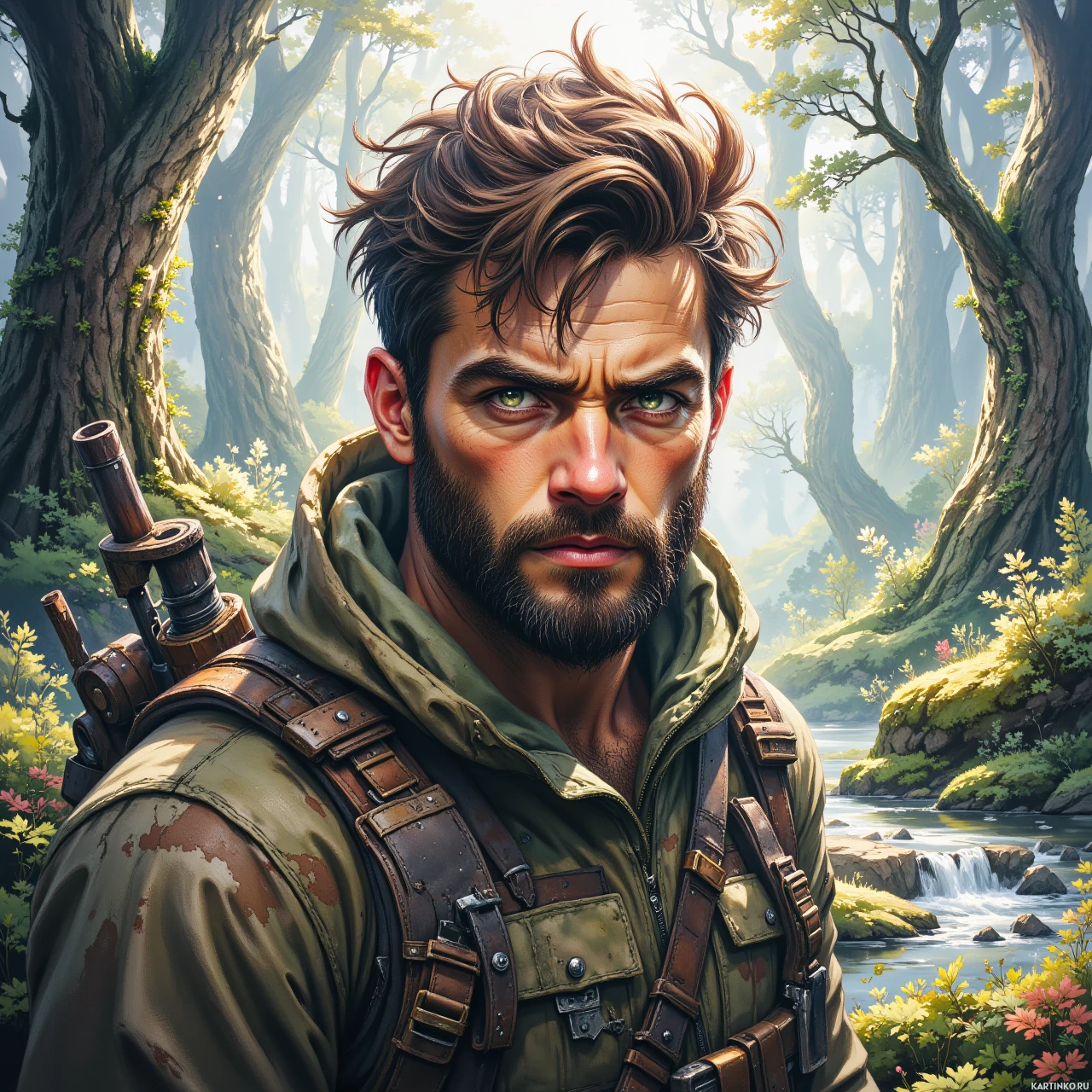 На картинке изображён мужчина с суровым лицом и грубыми чертами. У него тёмные волосы, лёгкая небритость и одежда, напоминающая камуфляж, с видимыми ремнями и пряжками, что говорит о возможной боевой или выживательной ситуации. На заднем плане – густой лес с толстыми стволами деревьев и зеленью.