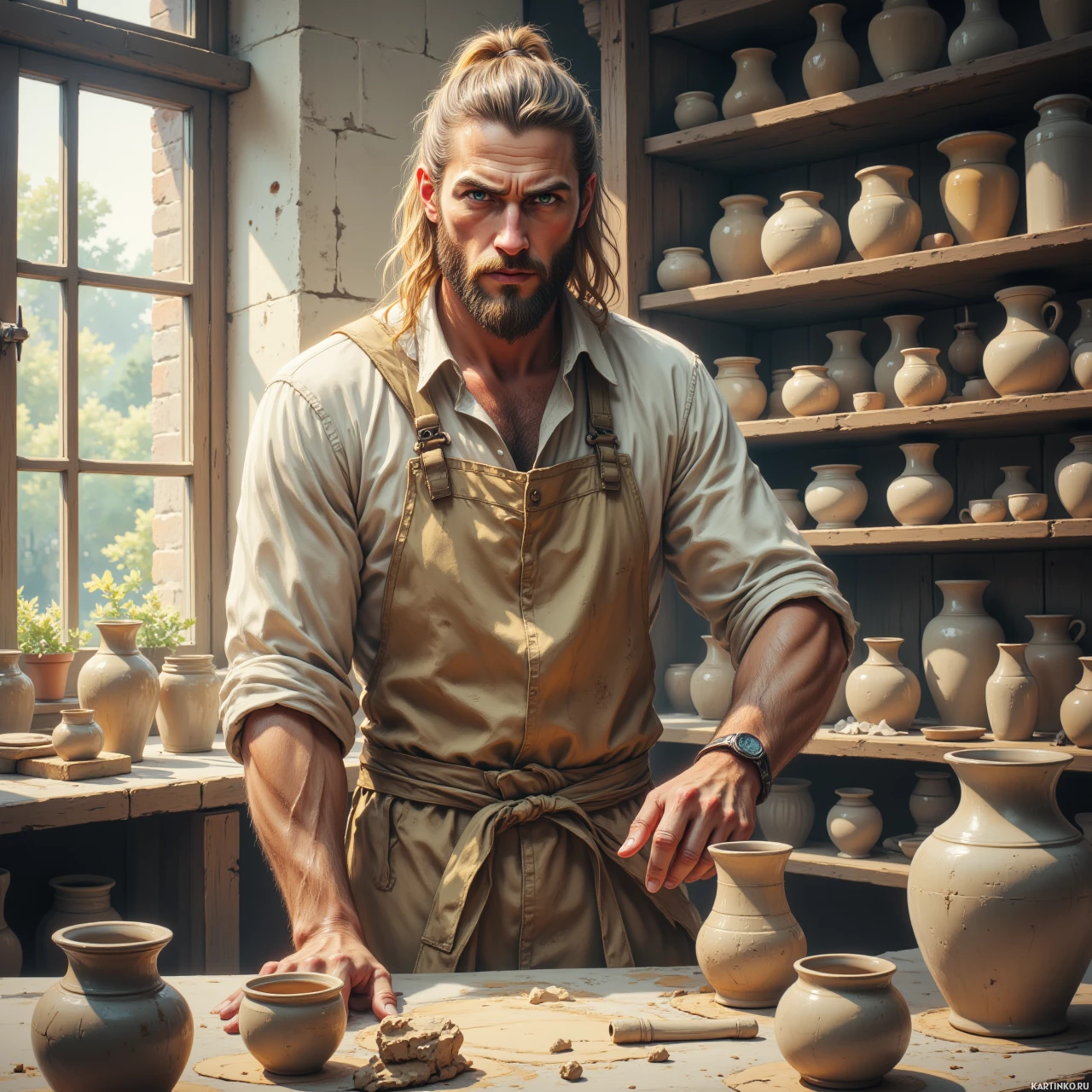 На картинке изображен мужчина в помещении, напоминающем гончарную мастерскую. У него длинные волосы, собранные в хвост, и на нем бежевый фартук поверх рубашки с воротником, что говорит о том, что он, вероятно, занят ручным трудом или ремеслом. На лице мужчины серьезное выражение, и он смотрит прямо на зрителя. Вокруг него разбросаны различные изделия из керамики, такие как вазы и чаши, сделанные, по всей видимости, из глины. На заднем плане видны деревянные полки, заполненные этими керамическими изделиями, что указывает на рабочее пространство для создания и хранения керамики. Стены имеют грубую текстуру, возможно, кирпичная кладка, и есть окна, через которые проникает естественный свет, создавая атмосферу традиционной мастерской ремесленника.