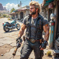 На картинке мужчина в тактическом снаряжении идет по улице, напоминающей пустыню. У него на бедре кобура с оружием, а через плечо – винтовка. Позади него, у обочины, припарковался мотоцикл. Место действия – старый город на Диком Западе, с обветшалыми зданиями. Мужчина смотрит в камеру, излучая уверенность и готовность.