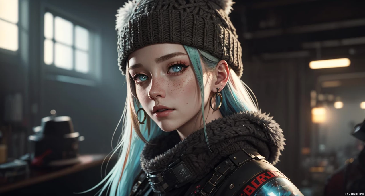 turquoise hair and are wearing a beanie. The individual is dressed in what appears to be a cyberpunk-inspired outfit, featuring shades of gray and black with fur accents. They have makeup applied to enhance their features. The background suggests