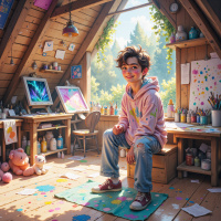 На картинке изображен молодой человек, сидящий на табурете в уютном деревянном сарае. Он смотрит прямо на зрителя с приветливым выражением лица, его освещает яркая улыбка. На нем повседневная одежда, и он выглядит очень молодо. В сарае полно всяких вещей, намекающих на творческое пространство: тюбики с краской, скетчбуки, стол с открытыми ящиками и полки с готовыми работами и художественными принадлежностями. Освещение на картинке указывает на дневное время, естественный свет льется через открытую дверь сарая. Цвета яркие, и общая атмосфера теплая и располагающая.