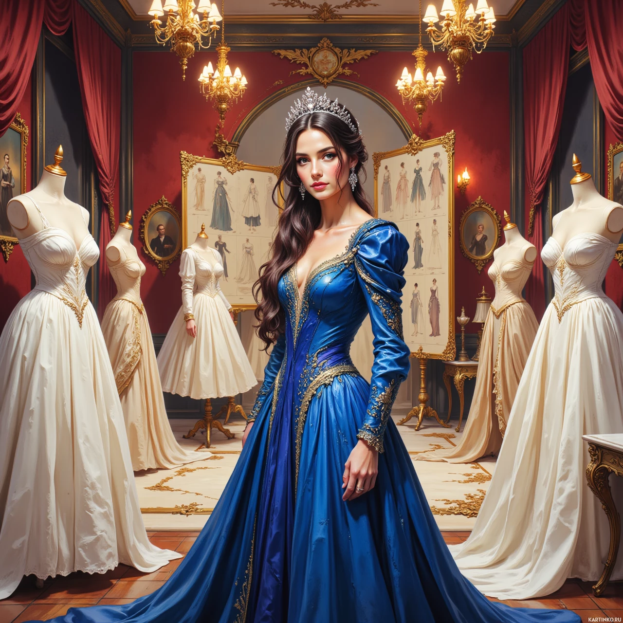 In the image, a young brunette girl is the central figure. She is dressed in an ornate blue gown with gold accents and a long train that drags on the floor behind her. Her hair is styled in elegant waves and she wears a tiara on her head. The background features mannequins displaying various historical dresses, suggesting a setting within a royal or historical context.