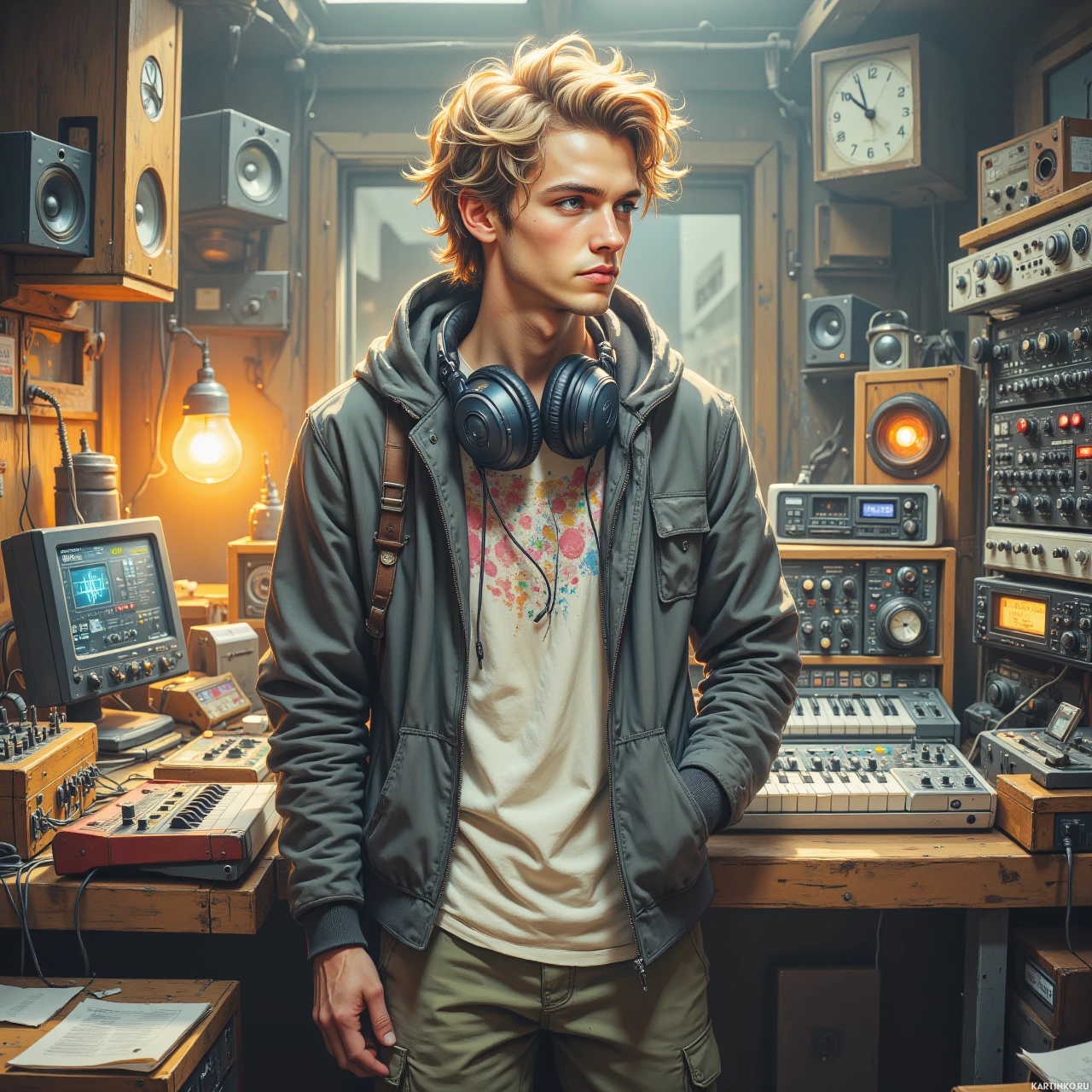 На картинке молодой человек стоит посреди множества аудиоустройств, похоже, в студии. У него растрепанные волосы и наушники на голове. На нем легкий худи с цветочным принтом. На заднем плане – различные аудиоустройства, включая микрофоны и колонки. Справа на стене висит часы. Освещение в комнате приглушенное, с теплым тоном, подчеркивающим аппаратуру позади мужчины.