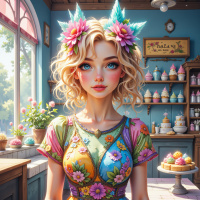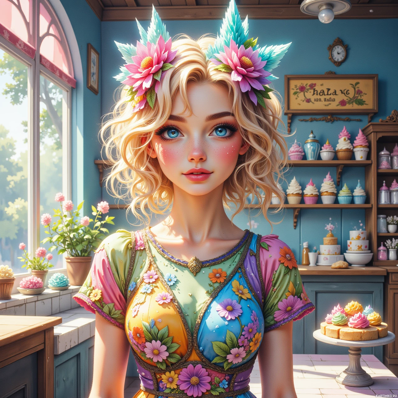 На картинке изображена молодая женщина с светлыми волосами в цветочном платье и венком на голове. У неё голубые глаза, и она смотрит прямо на зрителя. На заднем плане виднеется витрина кондитерской, за которой выставлены различные торты, а также горшки с растениями.